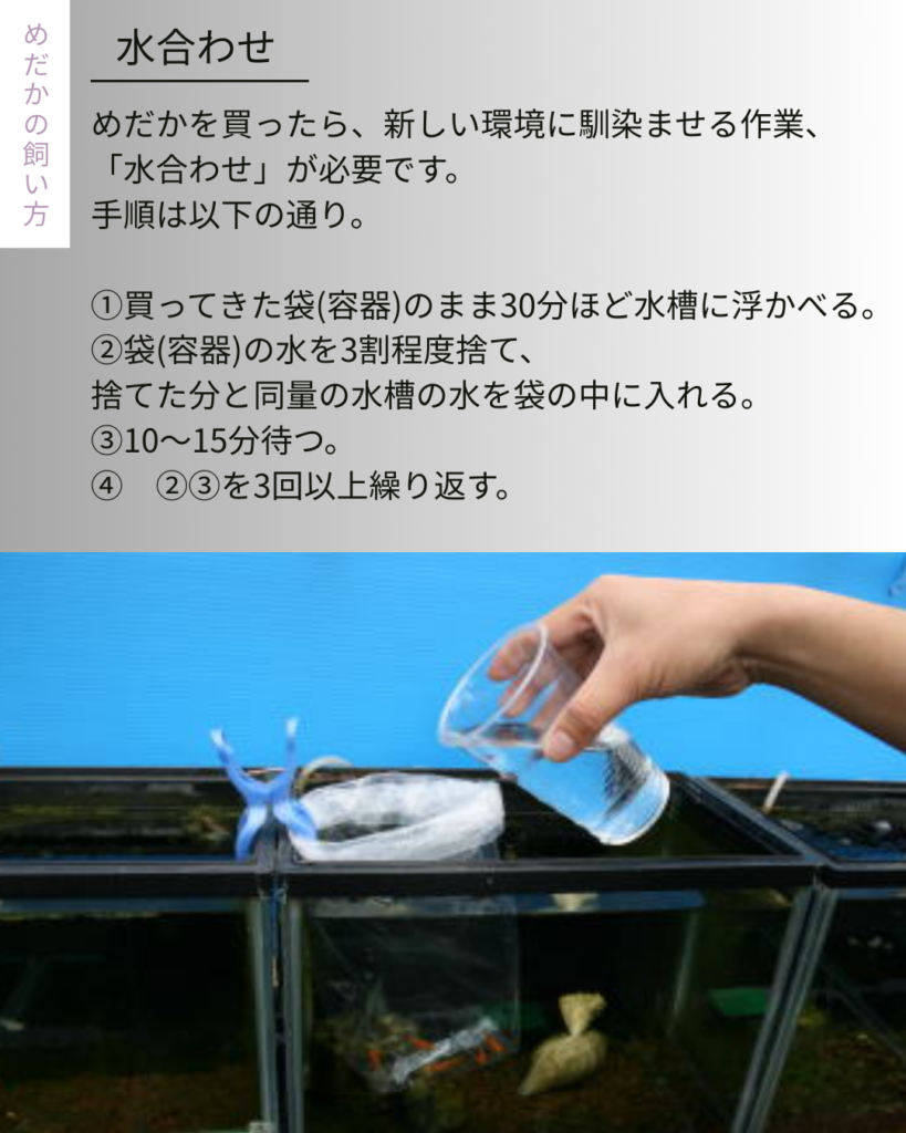 めだかは急な水温や水質の変化に弱いため、袋のまま水に浮かべて水温を合わせ、その後少しずつ飼育水を混ぜて慣らしてから移しましょう。